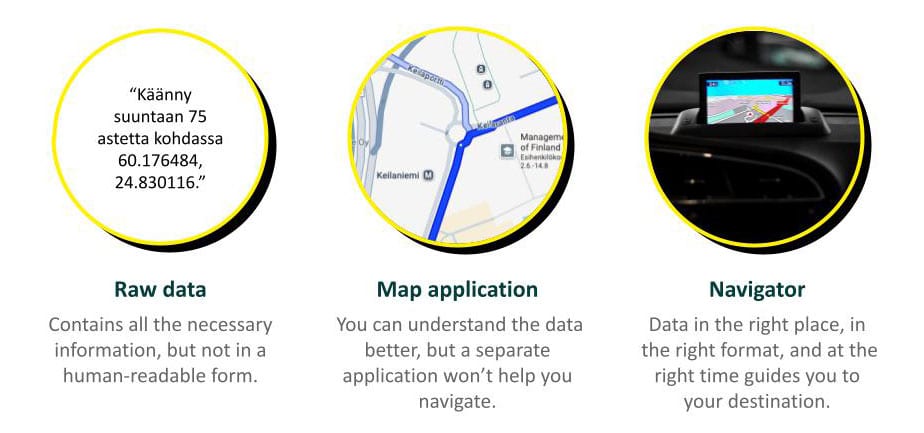 This still was better option than pure raw data, i.e. coordinates and vectors that make up the map and the route. But the car navigator offered a significant advantage over paper maps: it brought the data in the right format to the right place at the right time, and is now standard equipment in almost all cars.